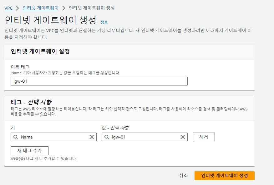 - 오른쪽 하단에 인터넷 게이트웨이 생성 클릭