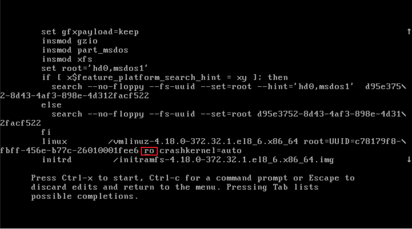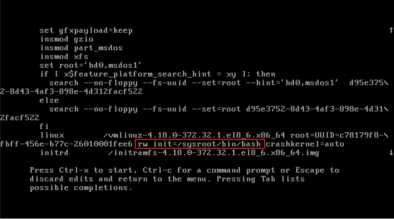 ro를 rw init=/sysroot/bin/bash로 수정하고 Ctrl+X 키를 눌러 single mode로 부팅해 준다.