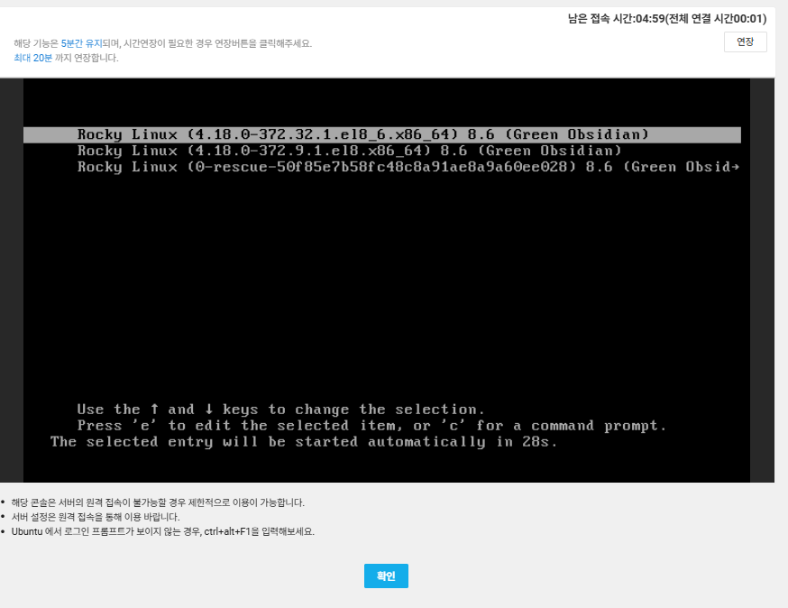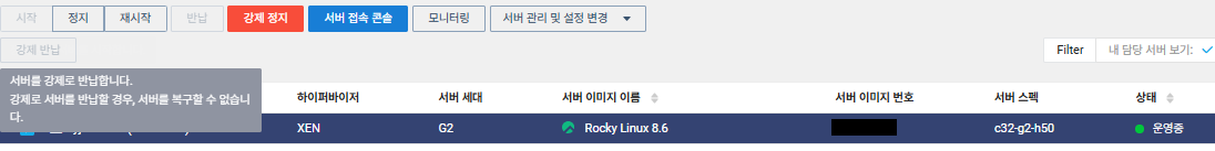 대상 서버를 정지한 후, 다시 시작시켜 주고 [서버 접속 콘솔]을 클릭해 준다.