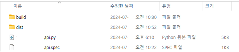 - build 폴더 : PyInstaller가 .exe 파일을 생성하는 동안 중간 단계를 저장하는 임시 디렉토리 (일반적으로 최종 배포에는 필요하지 않으므로 .exe 파일 생성 후에는 삭제해도 상관없다.)