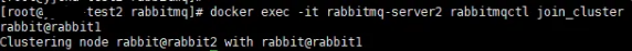 $ docker exec -it rabbitmq-server2 rabbitmqctl join_cluster rabbit@rabbitmq1