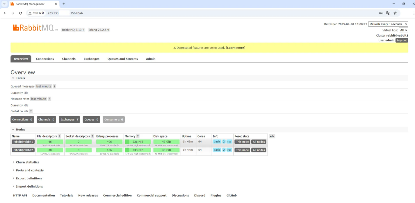 RabbitMQ란?오픈 소스 메시지 브로커로, AMQP(Advanced Message Queuing Protocol)를 기반으로 프로그램들이 서로 메시지를 주고받을 수 있도록 도와주는 메시지 큐 시스템이다. 애플리케이션 간 비동기 메시징을 가능하게 하며, 분산 환경에서 효율적인 데이터 처리를 지원한다.추가로, 이를 클러스터 구성하면 여러 개의 노드들을 하나의 시스템처럼 묶어서 함께 동작하도록 할 수 있다. 여러 노드를 연결해 하나의 클러스터를 만들면 메시지를 분산 처리하거나 특정 노드가 장애가 나도 다른 노드가 대신 역할을 수행할 수 있기때문에 안정성이 높아진다. RabbitMQ 클러스터 구성 방법0. 구성 환경 (네이버 클라우드)OS : Rocky Linux 8.10test1 서버 : rabbi..
