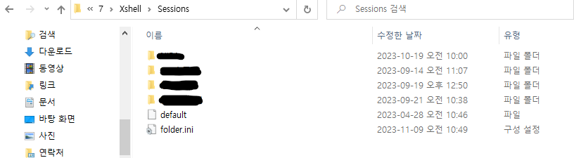 Xshell이란? Xshell은 Windows 환경에서 사용되는 터미널 에뮬레이터 주로 원격 서버에 SSH 프로토콜을 사용하여 접속하고 명령어를 입력하며 원격으로 서버를 관리할 때 사용됨 Xshell 세션 공유하는 방법 1. 윈도우에서 C:\Users\\Documents\NetSarang Computer\7\Xshell\Sessions 경로로 이동한다. 2. 해당 경로에 세선 폴더를 옮겨놓으면 된다. 참고) 숨김 폴더로 되어있을 경우 숨긴 폴더 표시되게 한 후 들어가기 폴더 상단 - 보기 - 표시/숨기기 - 숨긴 항목